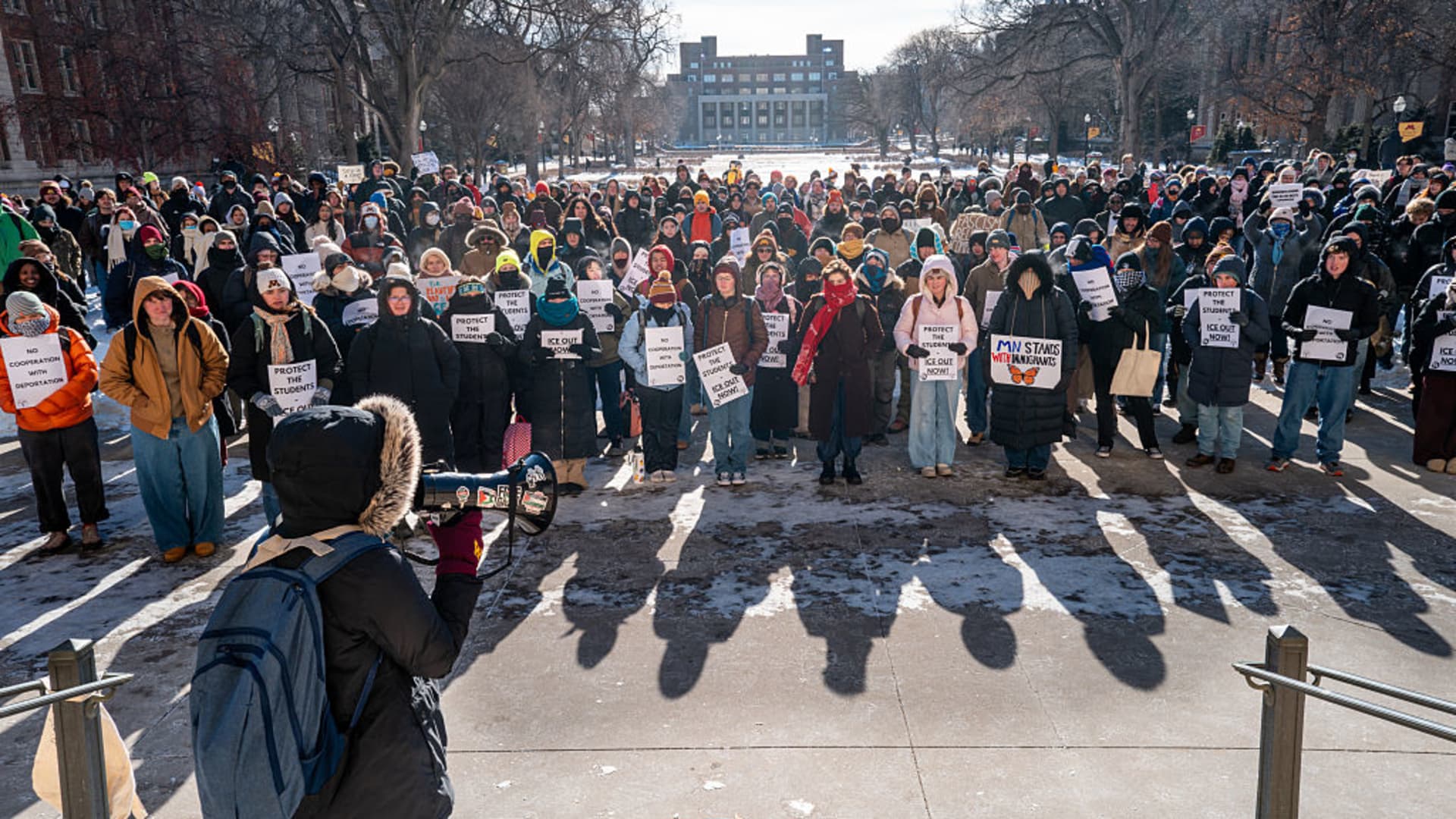 Students protest against ICE during a walkout at the University of Minnesota on Jan. 26, 2026 in Minneapolis, Minnesota.