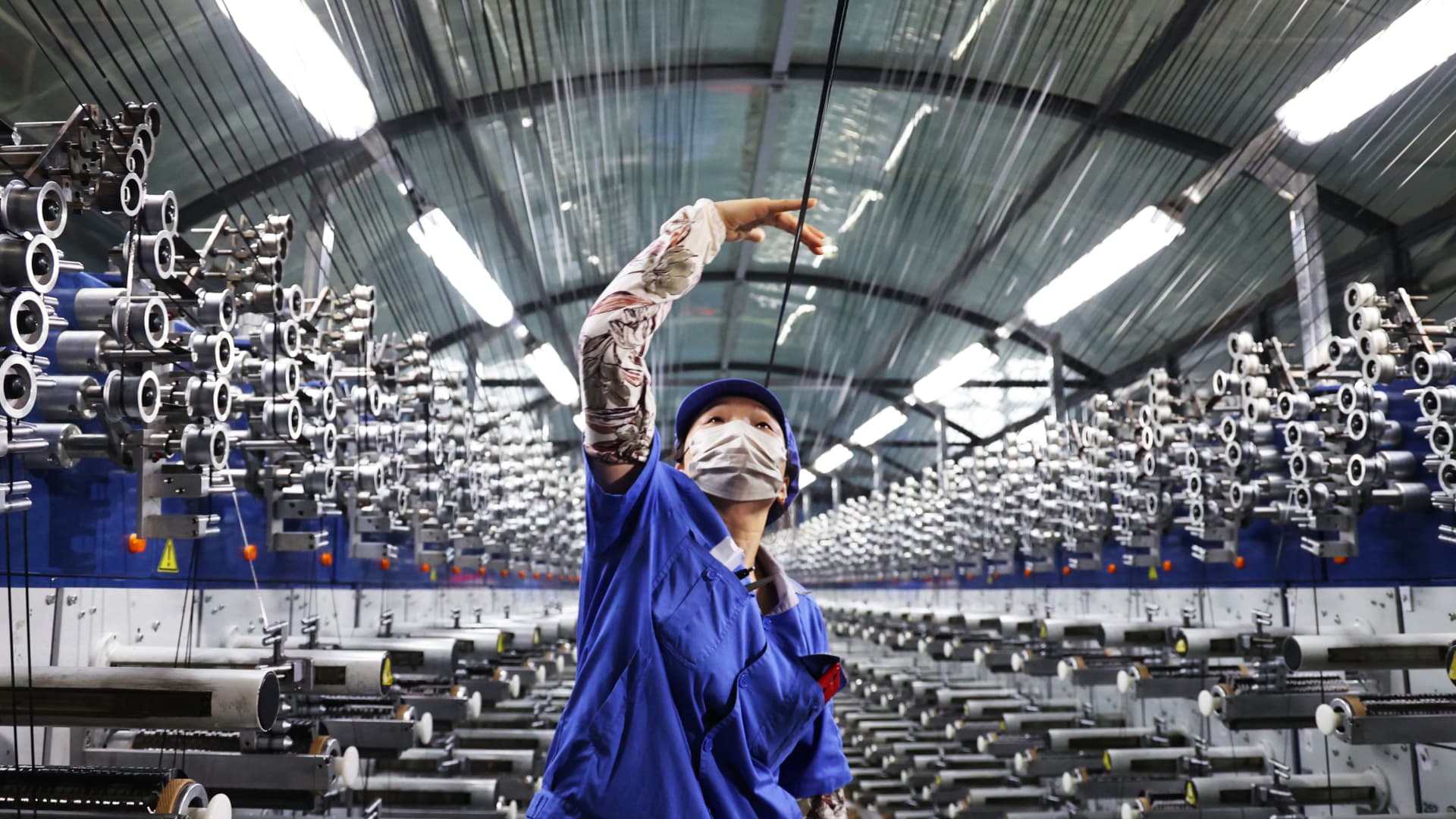 An employee works on a carbon fiber production line at Zhongfu Shenying in Lianyungang, China’s eastern Jiangsu province on July 31, 2025.