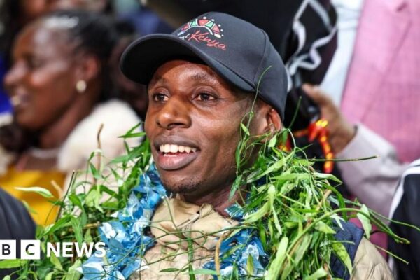 The first man to run a marathon in under two hours in a competitive race received a hero’s welcome from supporters and family when he arrived home. Source link
